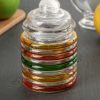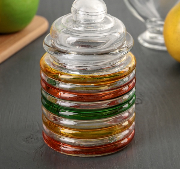 Емкости, используемые на кухне для хранения разнообразных сыпучих продуктов, могут изготавливаться из самых разнообразных материалов. Главное требование к таким изделиям - сохранение качества и всех других характеристик продукции. С помощью таких емкостей можно предотвратить негативное влияние влажности, насекомых, температур и так далее. Такие емкости удобны, поскольку при желании оценить, сколько содержимого осталось внутри, можно, не открывая крышку. Стекло отличается инертностью к химическим соединениям, а также простотой ухода. Оно также не впитывает запахи. В стеклянных банках можно в течение длительного времени хранить практически любые продукты. Стеклянные банки оснащаются пластиковыми крышками, которые обеспечивают герметичность. Стоит отметить, что такие емкости не подвержены деформации и растрескиванию. К числу преимуществ таких банок, следует отнести и их изящность.Материал - стекло.