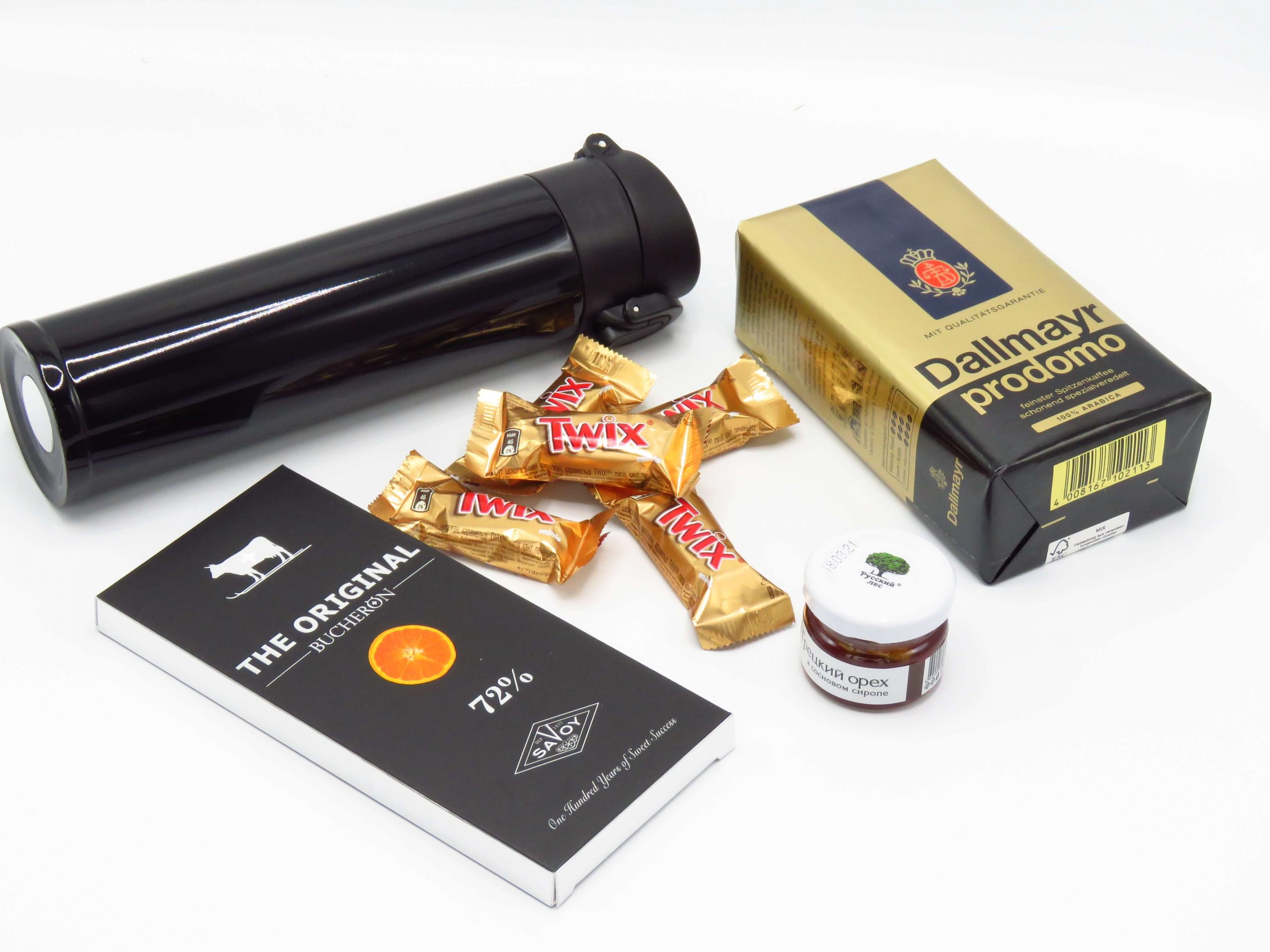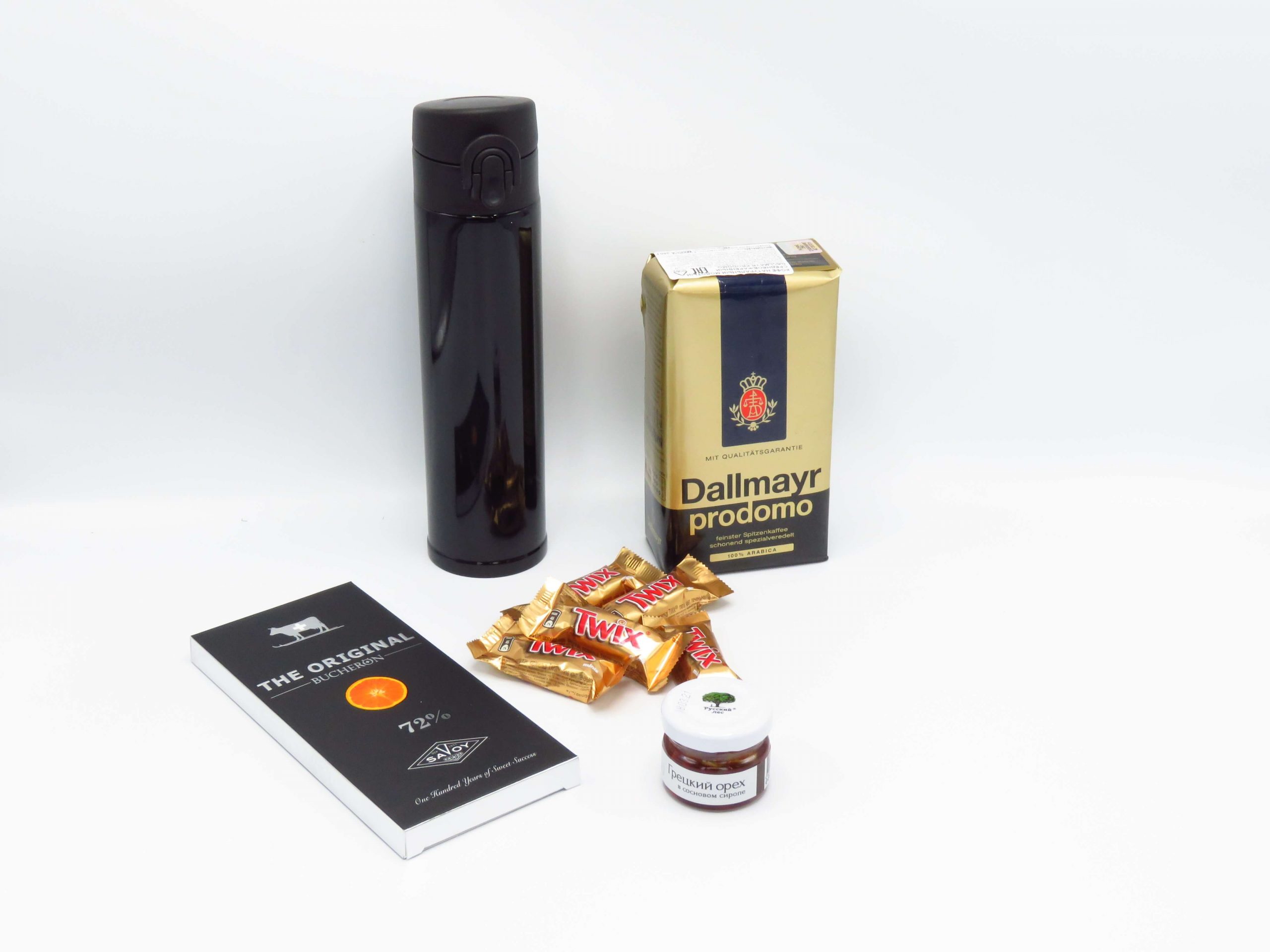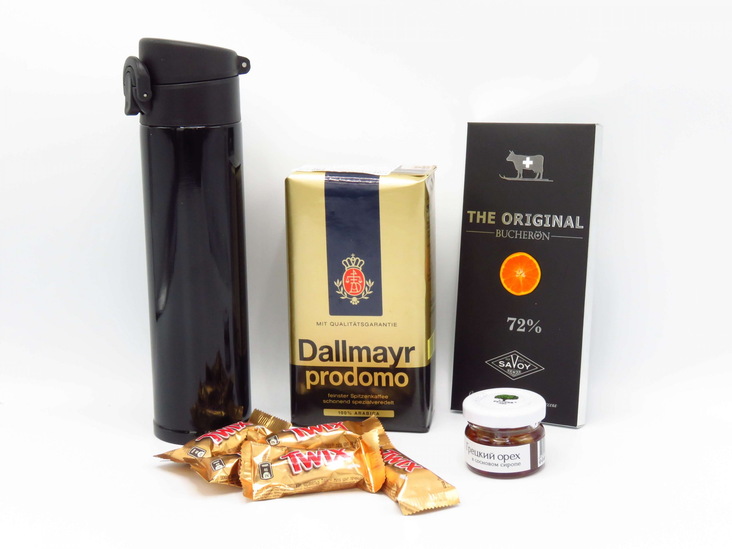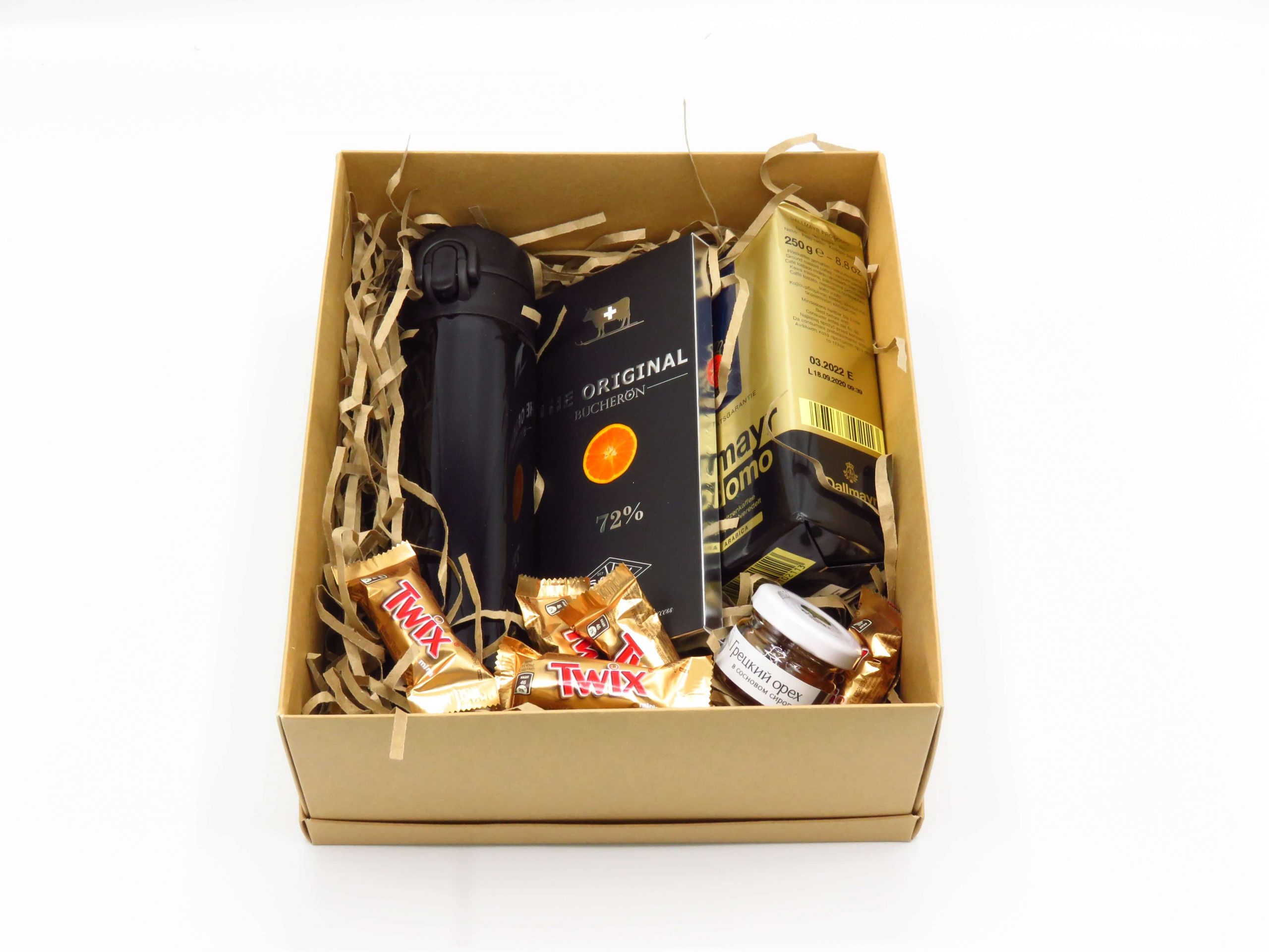 Подарочный бокс "Кофе и шоколад" состоит :- Термос "Gorgon" - снаружи металл, внутри металл, пластиковая крышка, 370 мл;