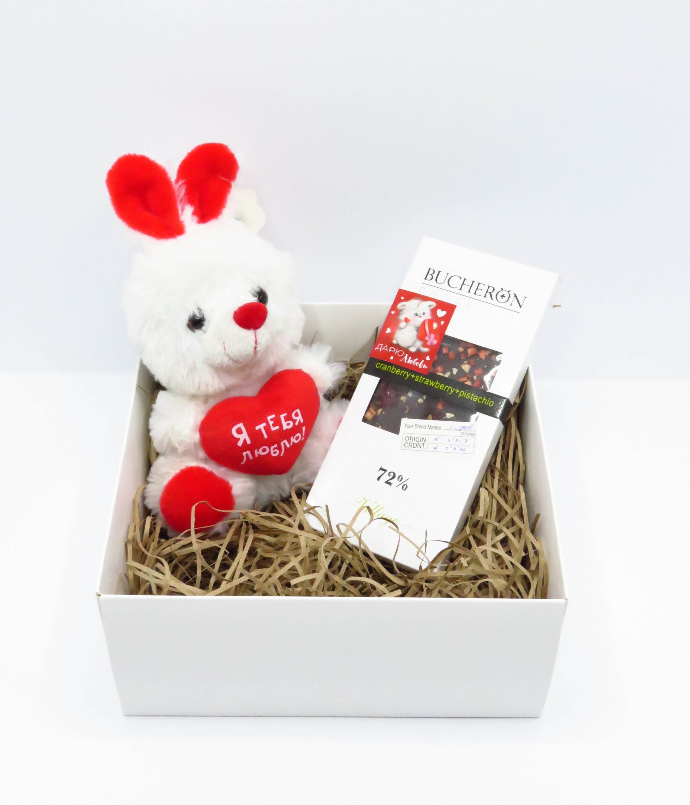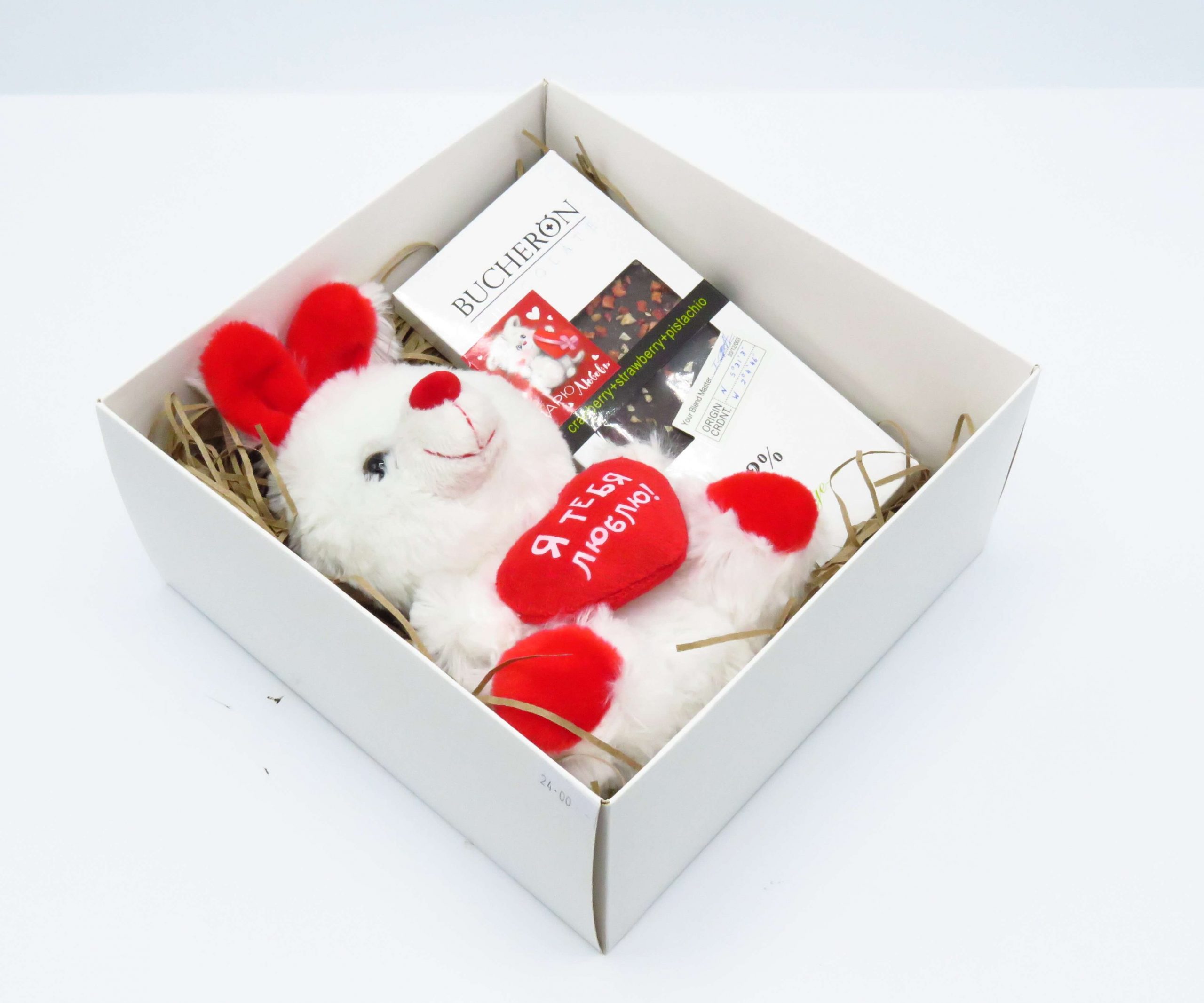 Состав подарочного набора "Дари Любовь":- Мягкая игрушка Зайчик с сердечком "Я тебя люблю";