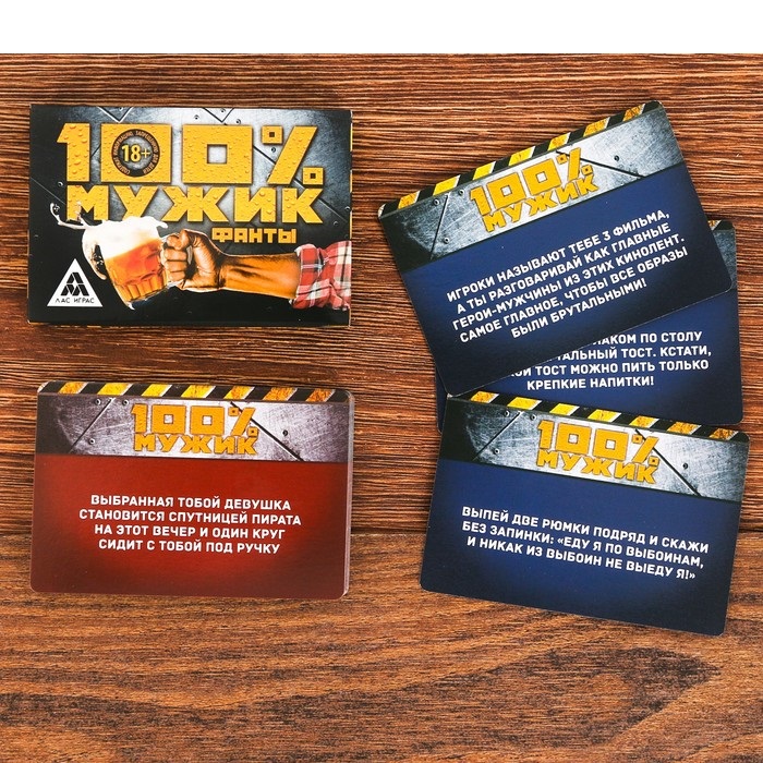 На одной стороне карточек собраны задания для настоящих мужчин. Они вам пригодятся, если у вас за столом собралась истинно мужская компания. А вот если среди присутствующих есть представительницы прекрасного пола, подключайте к игре вторую сторону фантов. Как только мужчина справится с заданием, он переворачивает карточку и зачитывает, чем его наградит выбранная девушка.Внутри вы найдёте: