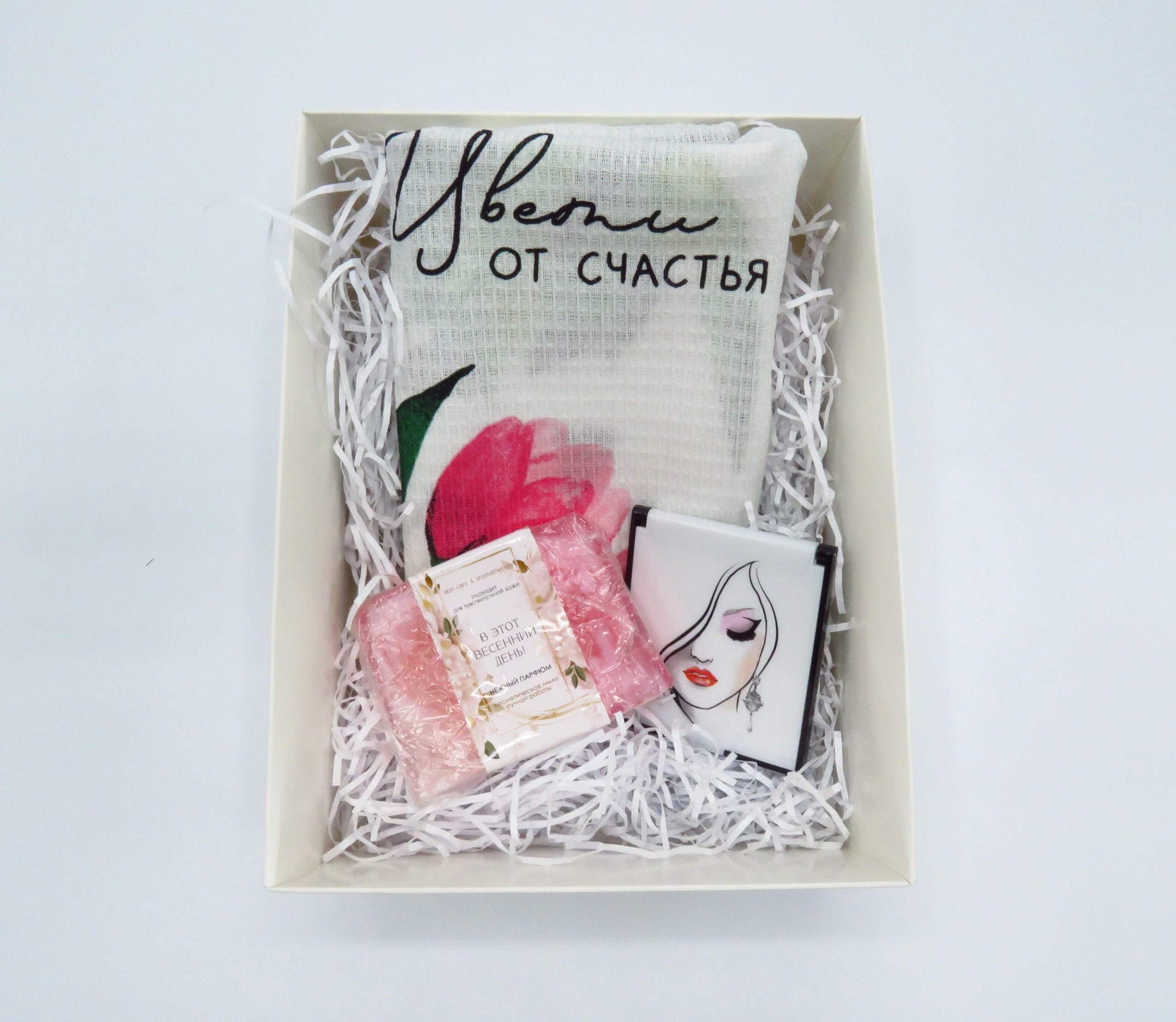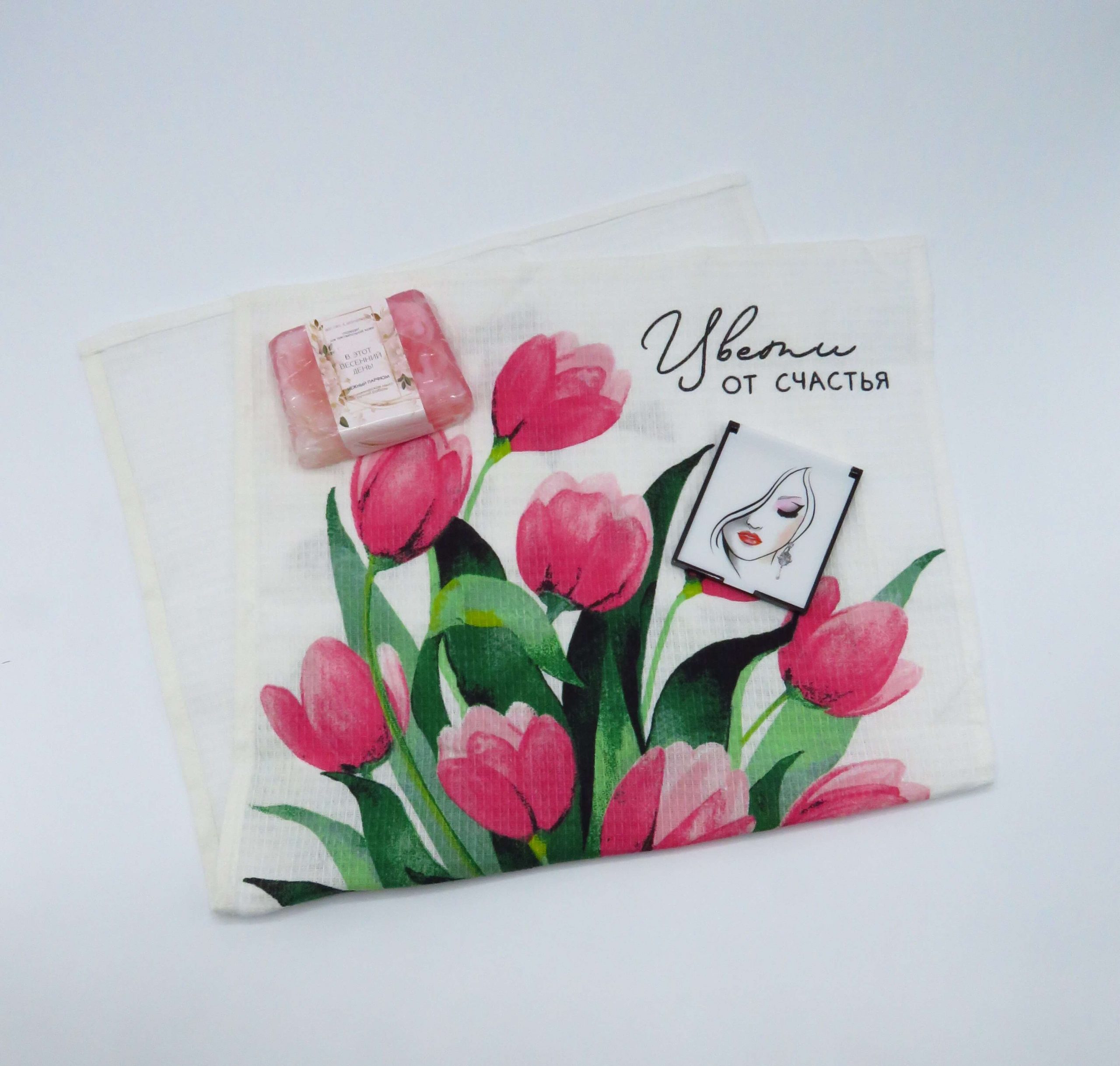 Состав подарочного набора "Приятный сюрприз":- Полотенце “Цвети от счастья” 35х60 см, 100% хлопок, 160г/м2;