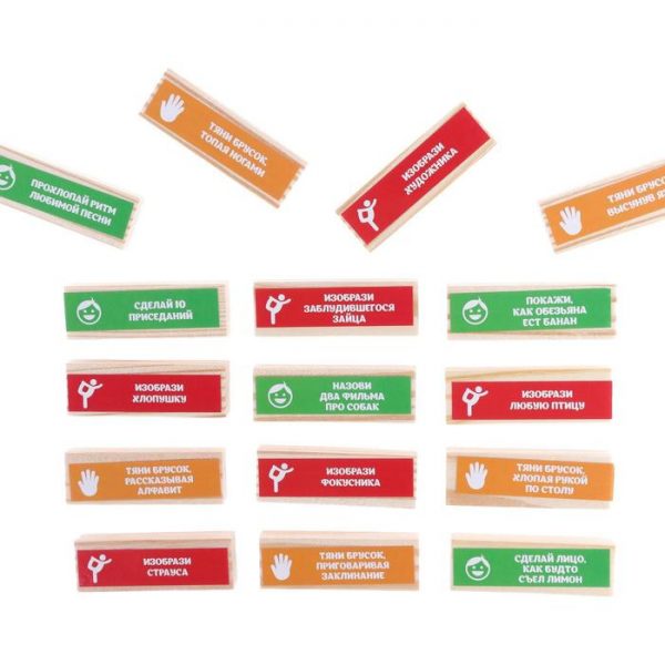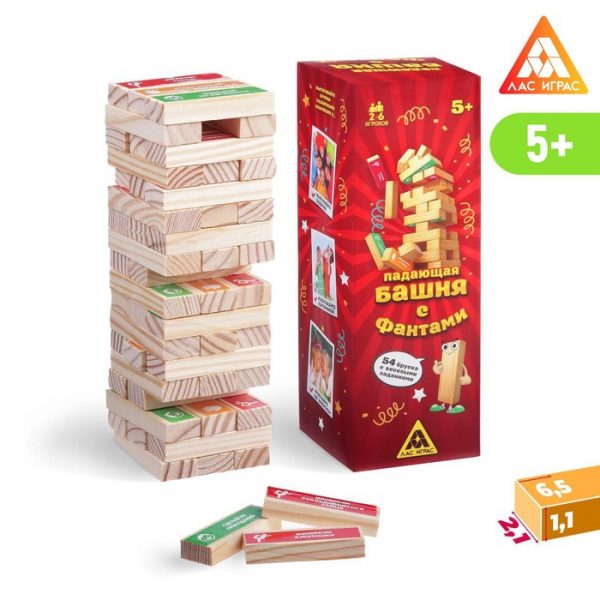 В коробке вы найдёте 54 брускf с фантами. Постройте башню, укладывая их в ровные ряды по три штуки. Вытягивайте бруски по очереди так, чтобы конструкция не упала. Вас ждут самые разные задания: предстоит изображать различных персонажей, тянуть бруски необычными способами и общаться с друзьями. Победит тот, кто вытянул брусок последним до того, как башня развалилась.Возьмите «Падающую башню»: