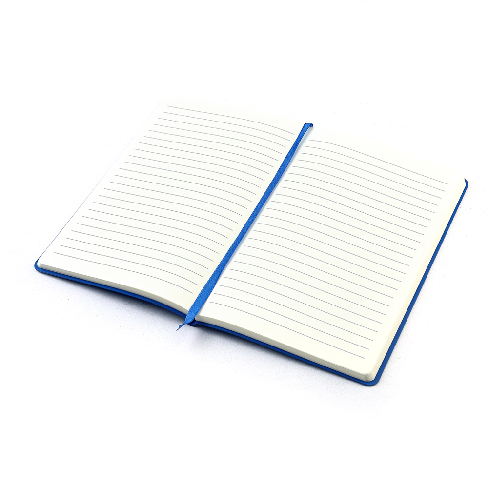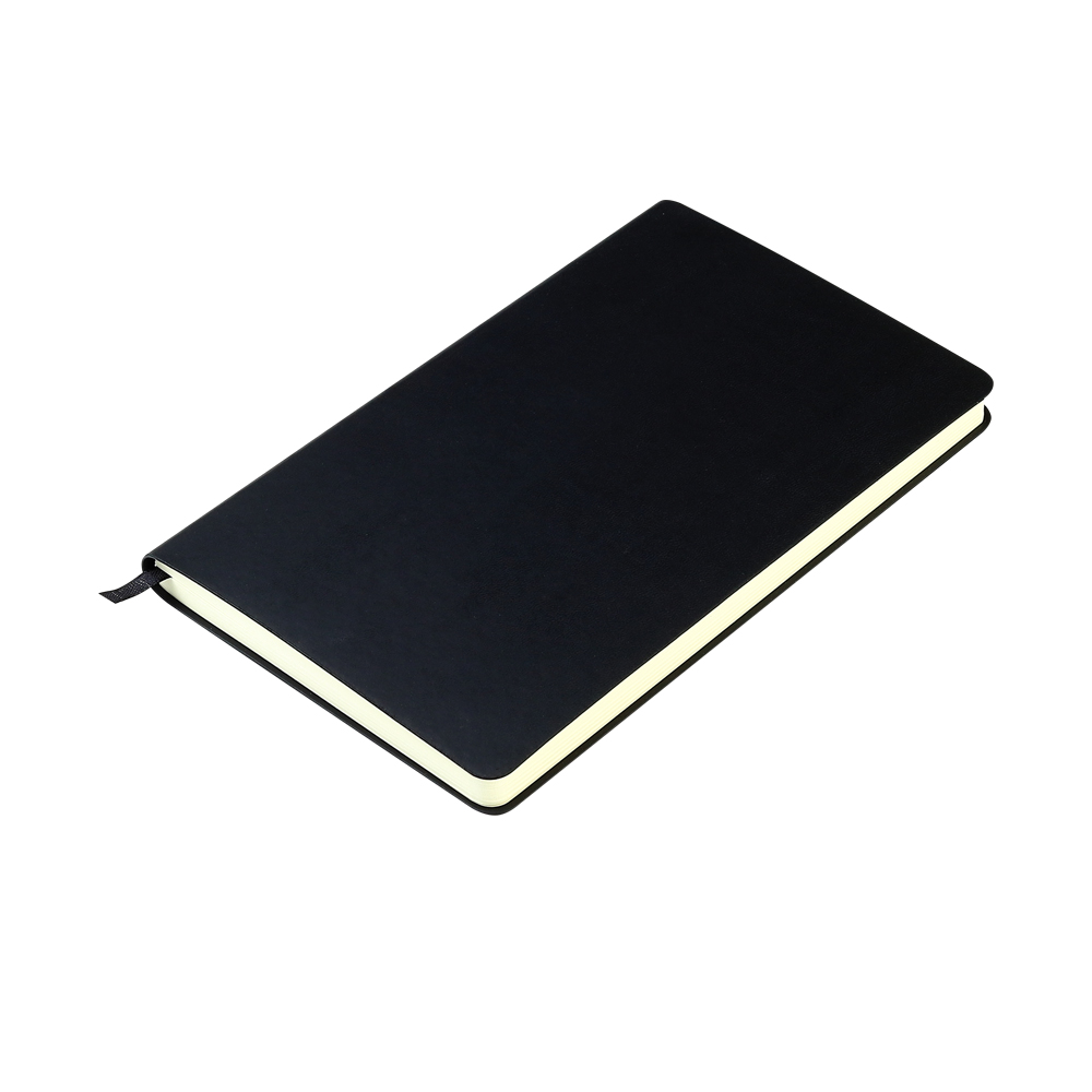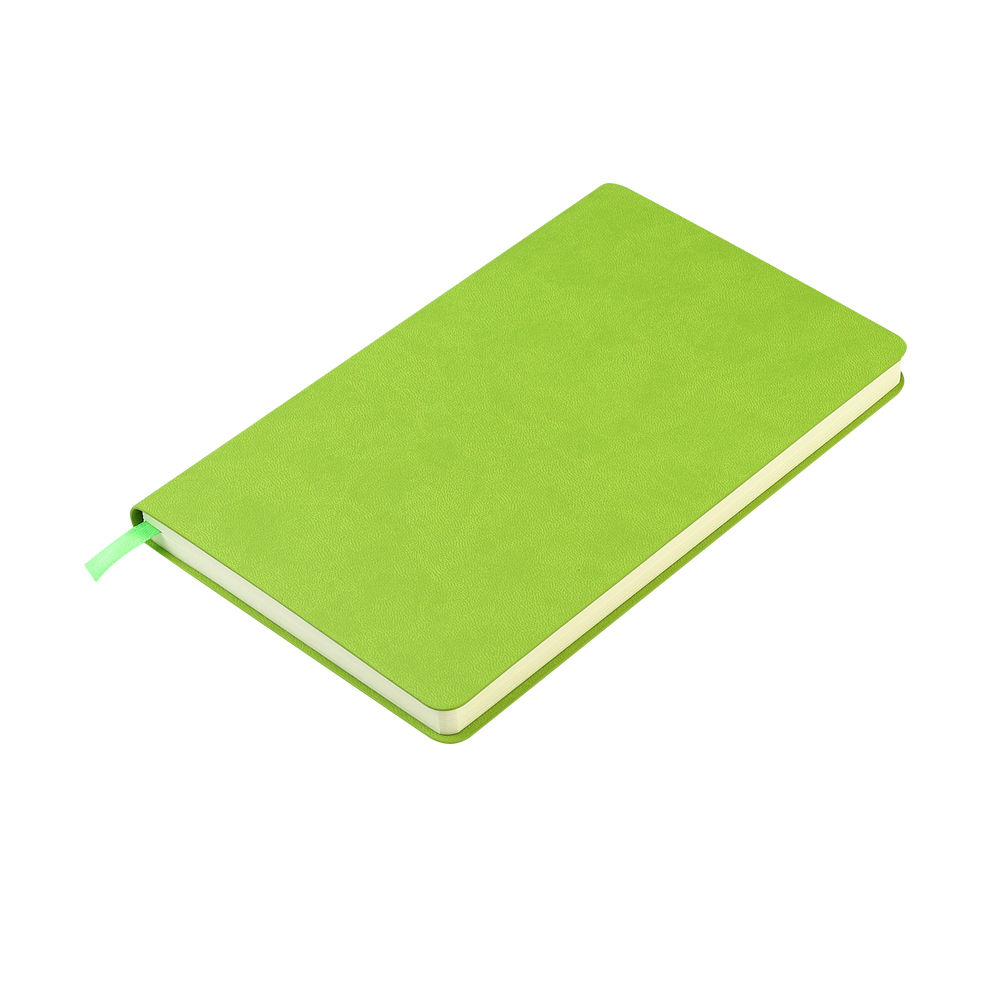 Блокнот формата А5 с мягким покрытием из PU-материала с имитацией рисунка кожи, с текстильной закладкой в цвет блокнота, 256 страниц, плотность 70г/м, страницы с черными линиями.