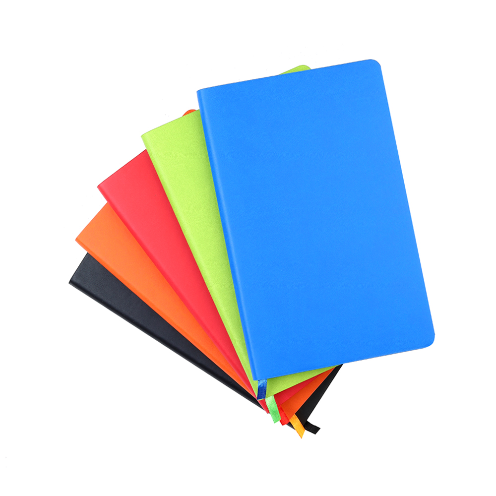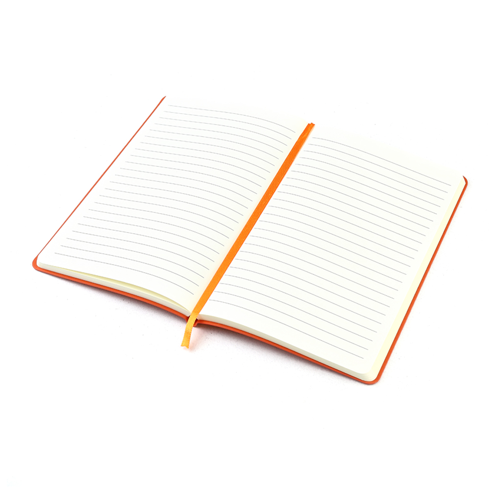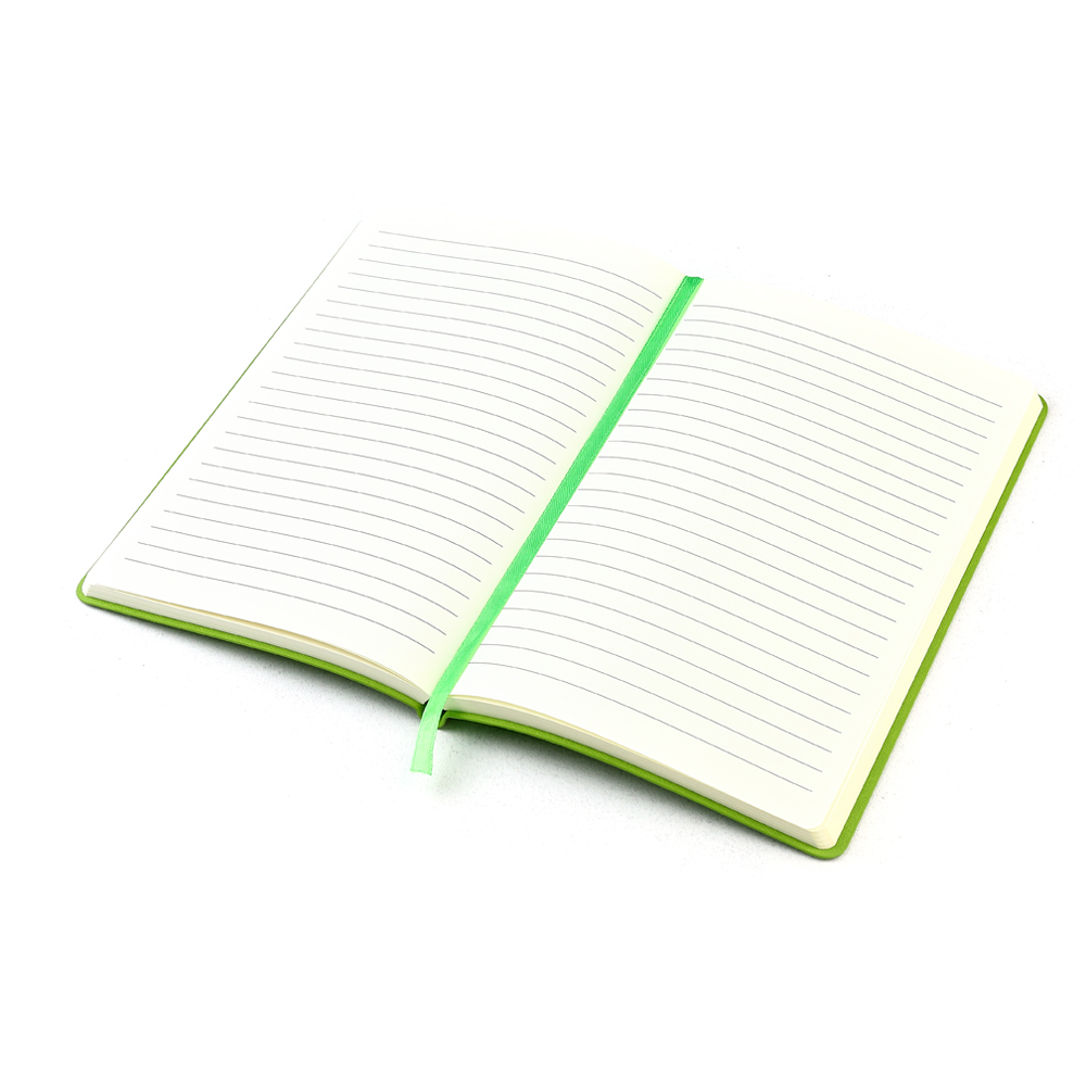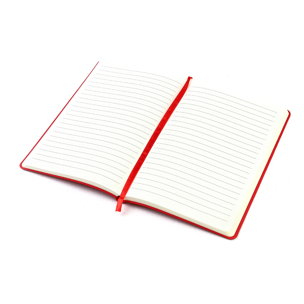 Блокнот формата А5 с мягким покрытием из PU-материала с имитацией рисунка кожи, с текстильной закладкой в цвет блокнота, 256 страниц, плотность 70г/м, страницы с черными линиями.