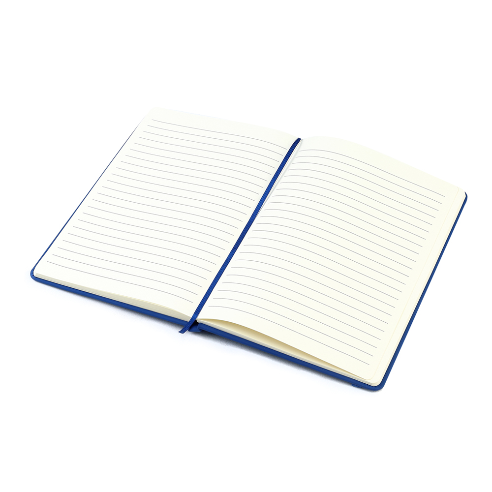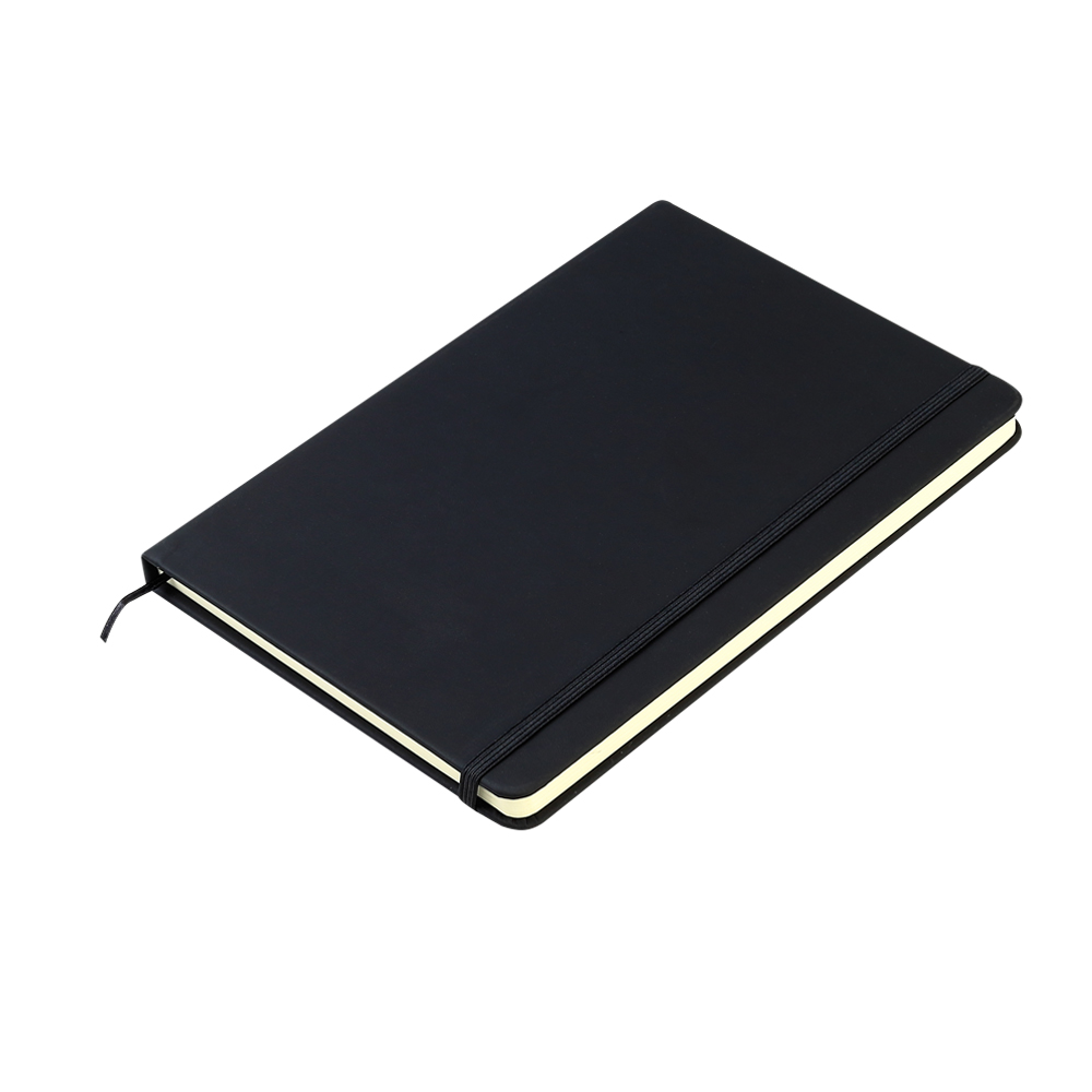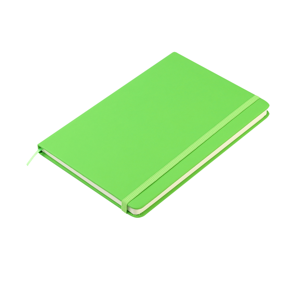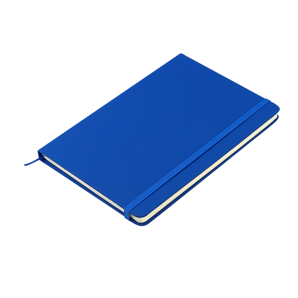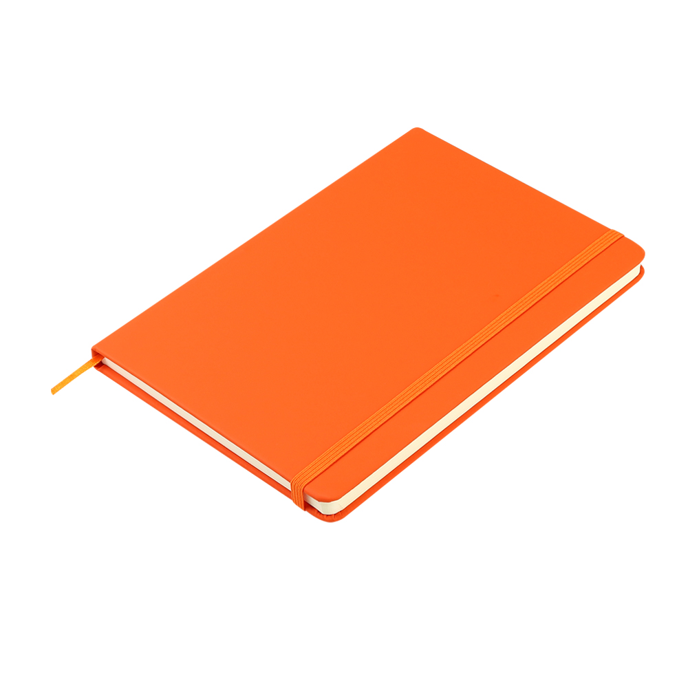 Блокнот формата А5 с твердым покрытием из PU-материала с имитацией рисунка кожи, с эластичной застежкой для закрытия и текстильной закладкой в цвет блокнота, 192 страницы, плотность 70г/м, страницы с черными линиями.