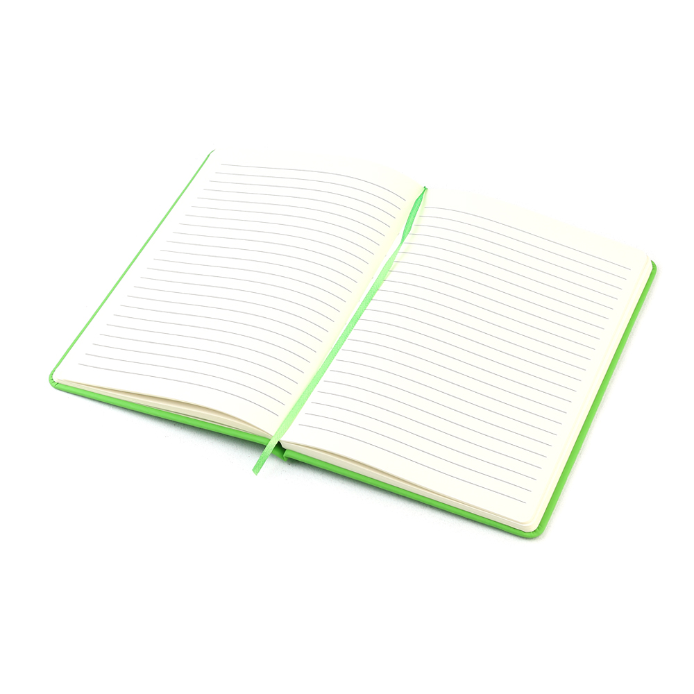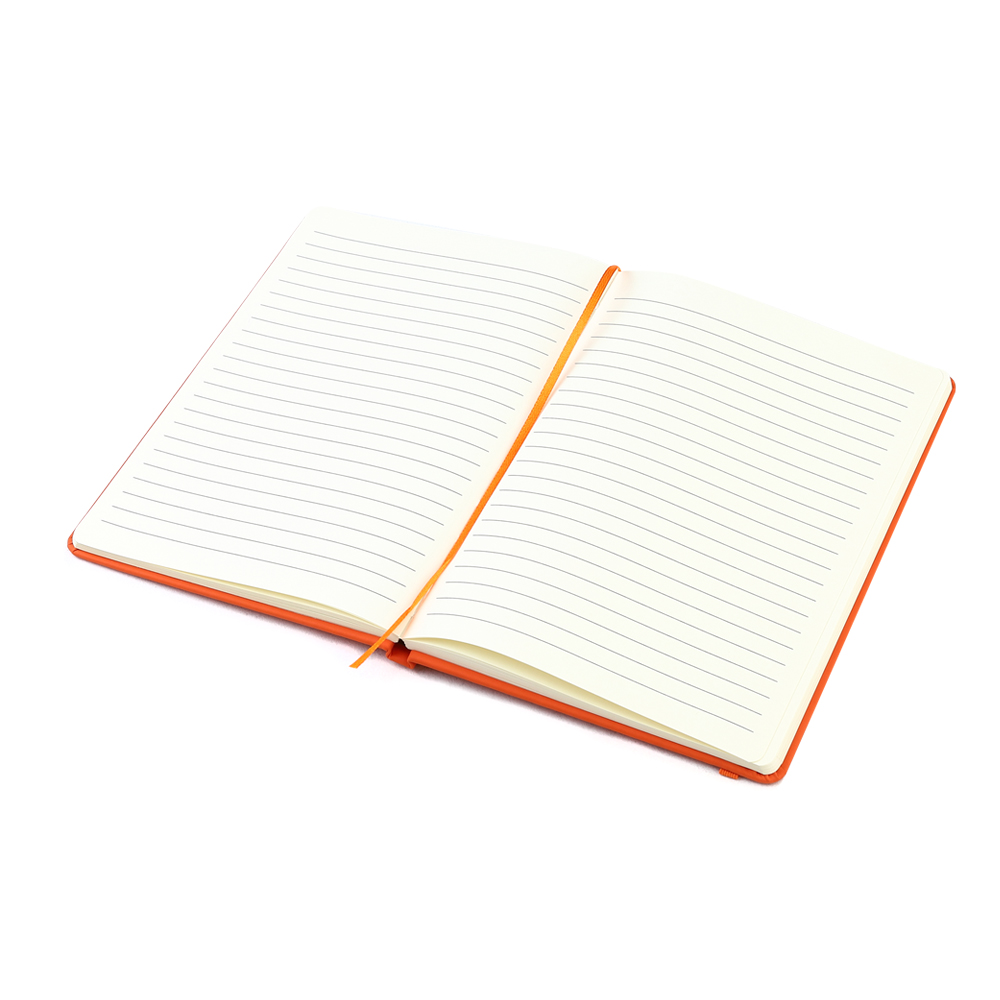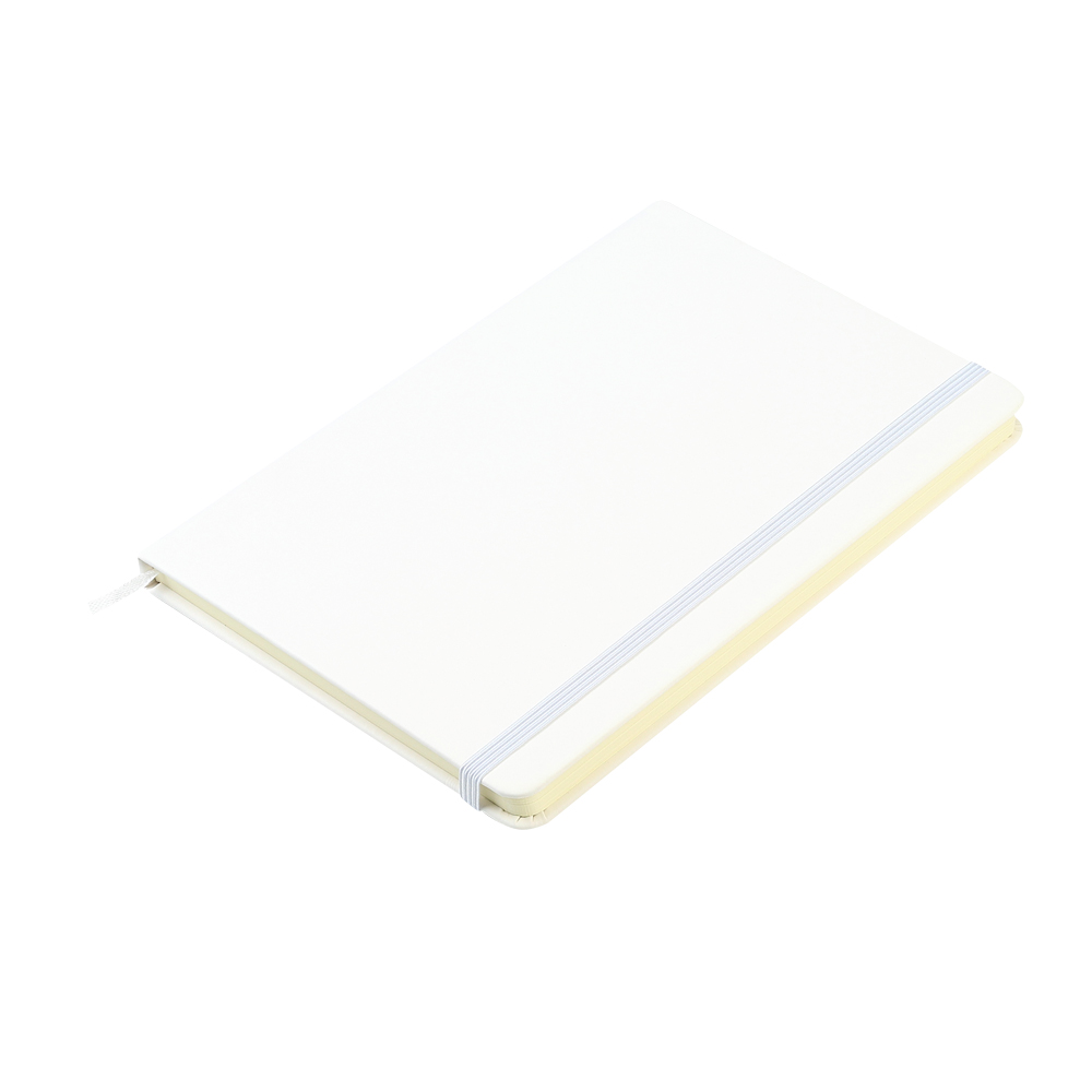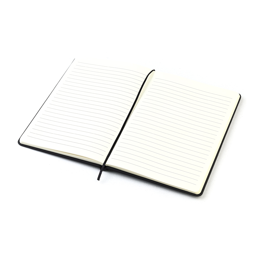 Блокнот формата А5 с твердым покрытием из PU-материала с имитацией рисунка кожи, с эластичной застежкой для закрытия и текстильной закладкой в цвет блокнота, 192 страницы, плотность 70г/м, страницы с черными линиями.
