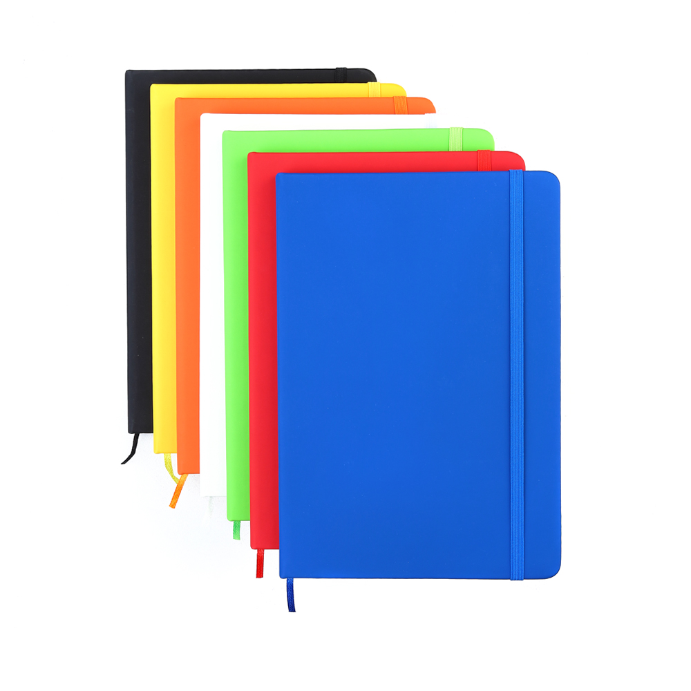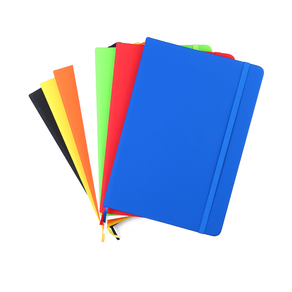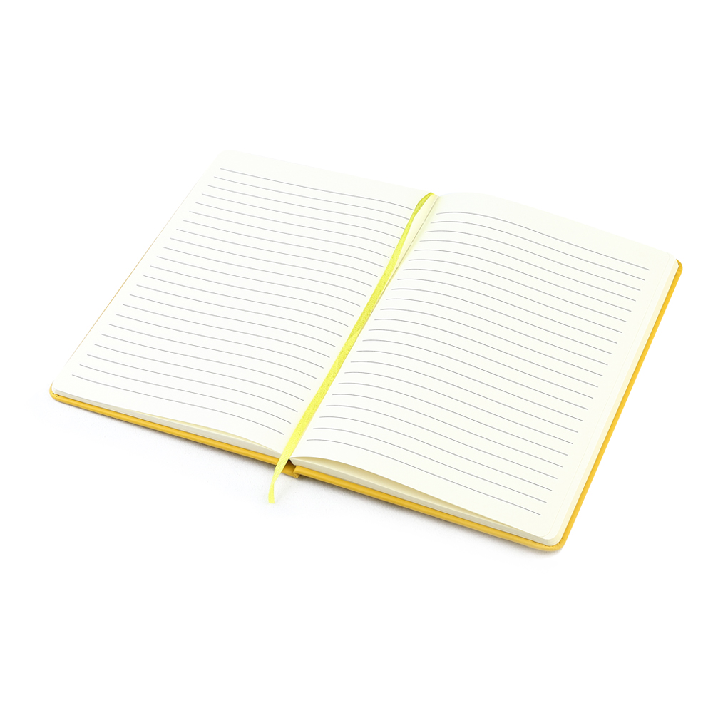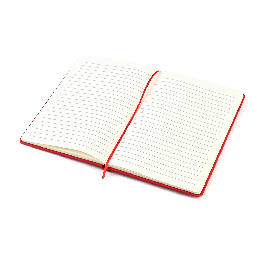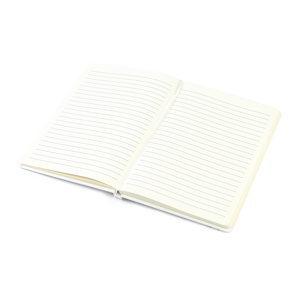 Блокнот формата А5 с твердым покрытием из PU-материала с имитацией рисунка кожи, с эластичной застежкой для закрытия и текстильной закладкой в цвет блокнота, 192 страницы, плотность 70г/м, страницы с черными линиями.