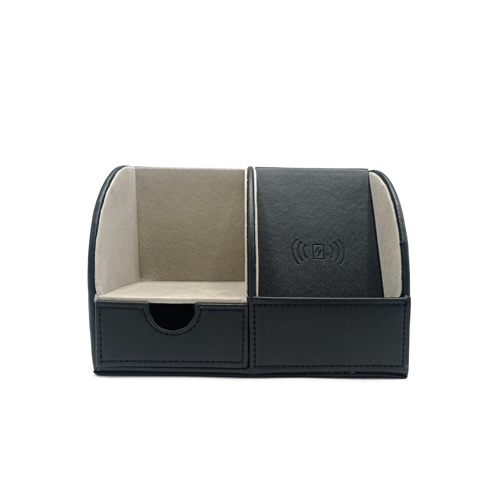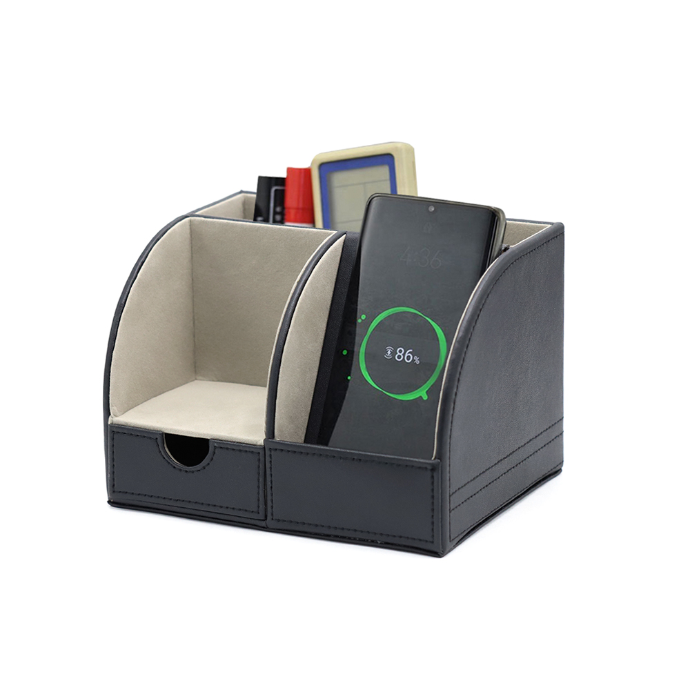 Органайзер "Форма" имеет встроенную беспроводную зарядку, что выгодно отличает его от аналогов. Данная модель имеет качественно покрытие из кожзама и много отделений для офисных мелочей